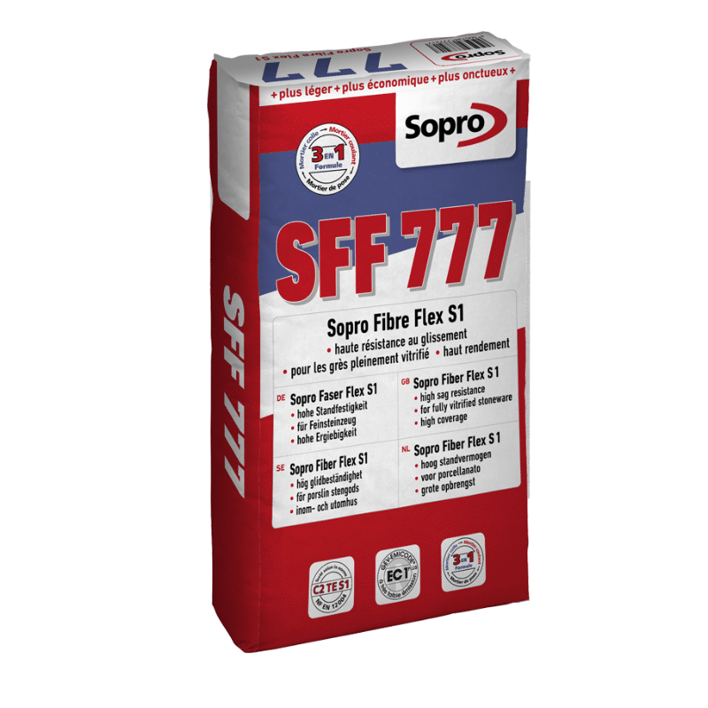 La Sopro 777 est une colle grise hautes performances à base de ciment, spécialement conçue pour la pose de pierres naturelles, carreaux en grès cérame et dalles de grand format. Sa formule renforcée aux résines synthétiques assure une adhérence exceptionnelle, même sur les supports difficiles, et une excellente résistance mécanique dans le temps.