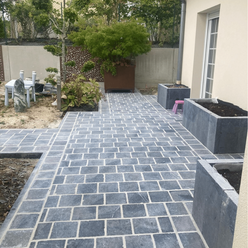Authentique et résistante, la Pierre Bleue du Vietnam offre un aspect naturel et nuancé, idéal pour créer des aménagements extérieurs durables au charme minéral intemporel.